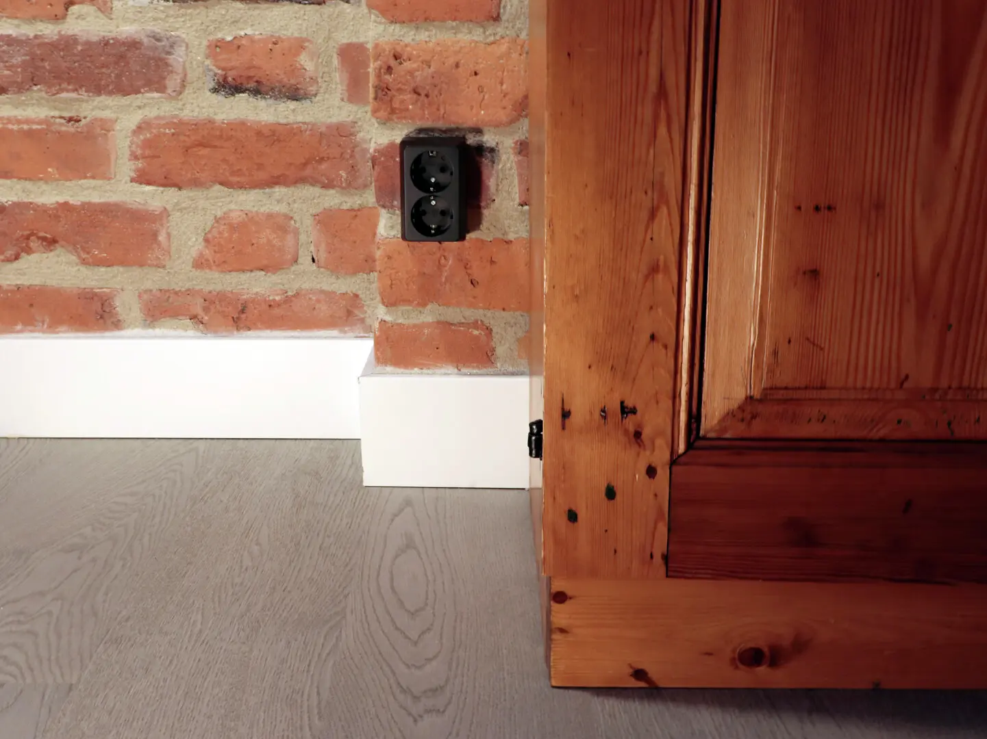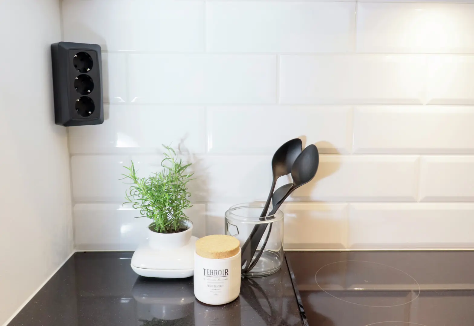 Musta kolmiosainen HIILI-kulmapistorasia näyttää hyvältä myös valkoiseen pintaan asennettuna!